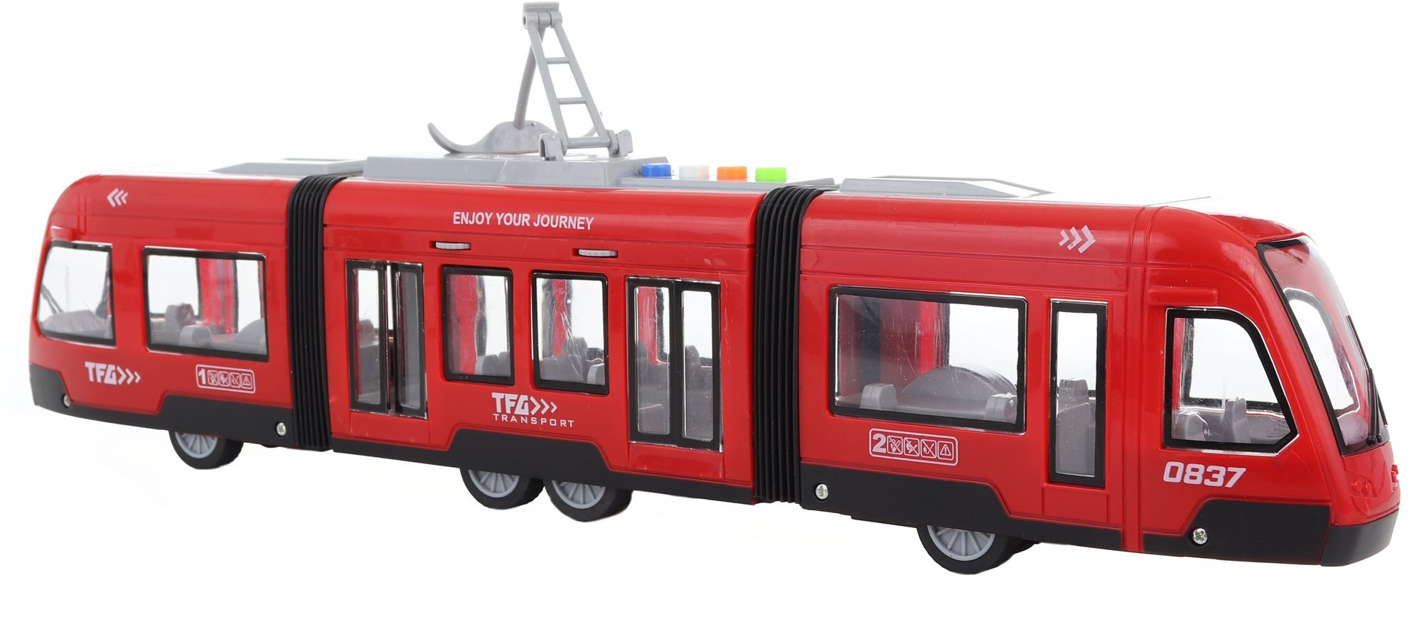 Vláčik – materiál plast, ovládanie tlačidlami na hračke, so svetelnými a zvukovými efektami, na 3 AG13 batérie (sú súčasťou balenia), rozmery 44,5 × 5,8 × 12 cm (D׊×V), vhodný od 3 rokov Plastová električka na batérie Lamps so svetelnými a zvukovými efektmi je nádherným darčekom pre všetkých chlapcov, ktorí milujú dopravné prostriedky jazdiace po koľajniciach. Električka v mierke 1:16