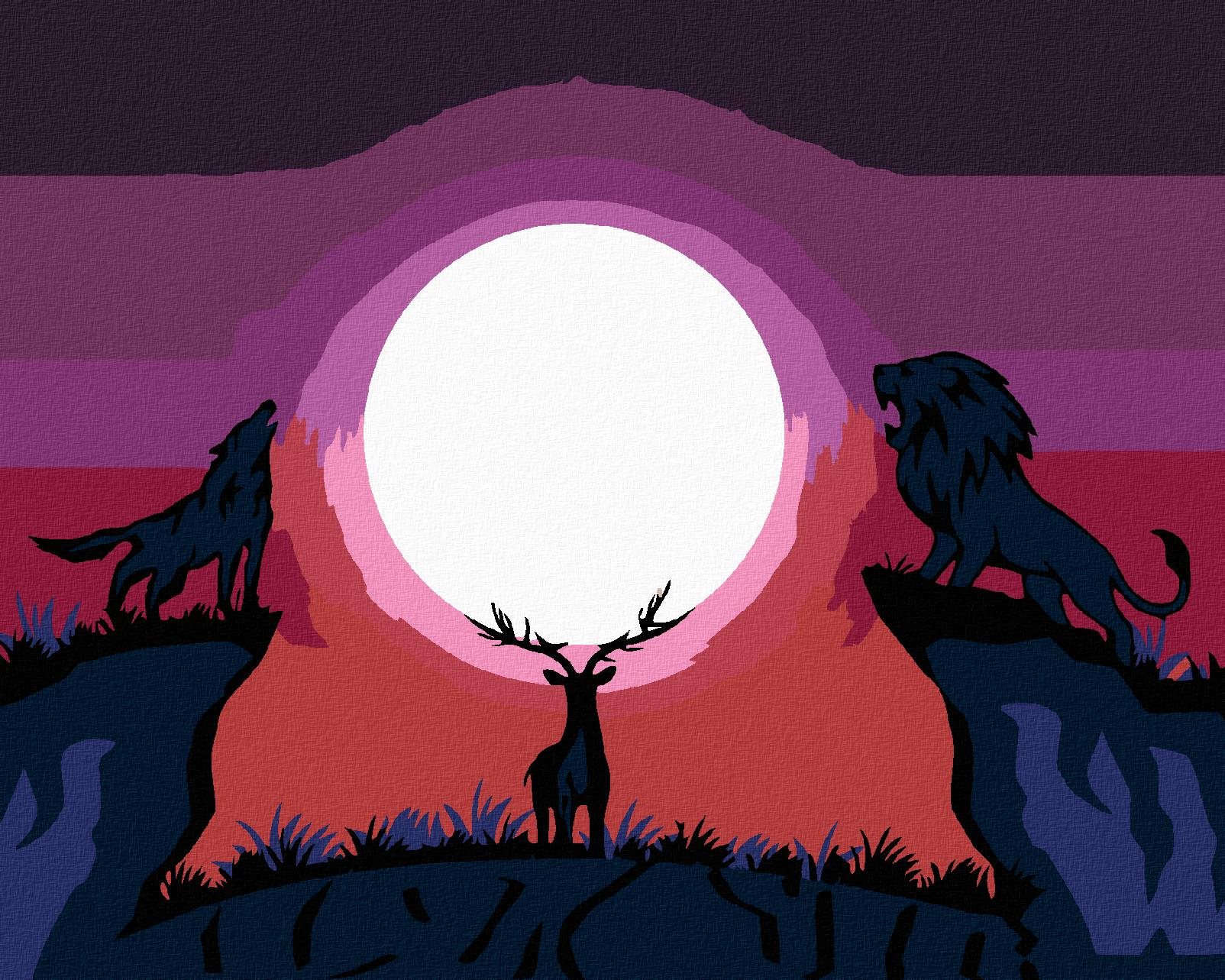 Maľovanie podľa čísel – tematika zvieratá, veľmi ľahká náročnosť, plátno, súprava štetcov, farby a vymaľovaný vzor súčasťou balenia, s rámom a s napnutím plátna, rozmery 50 × 40 cm (V׊) Kľúčové vlastnosti maľovania podľa čísel Vlk s levom pozerajúci sa na jeleňa, 40×50 cm, vypnuté plátno na rám Maľovanie podľa čísel si zamilujú tvoriví jedinci Materiálom plátna je drevo a ľan Rozmery