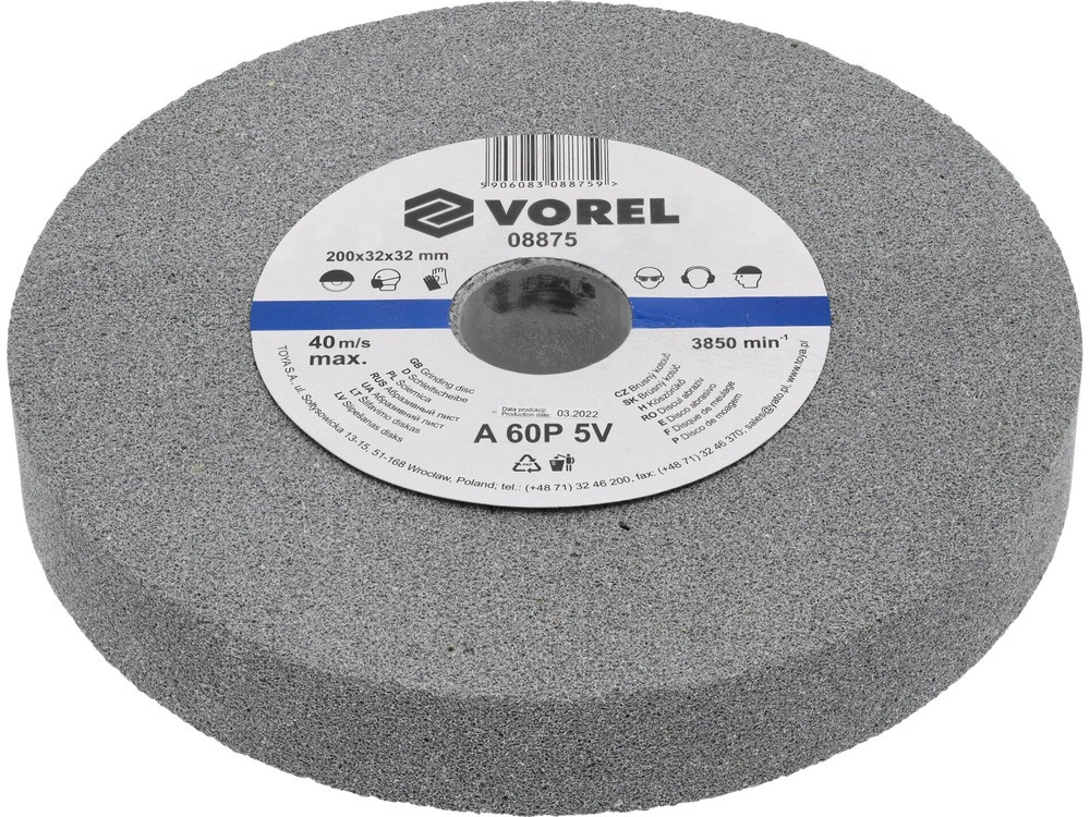 Brúsny kotúč na kov – rovný, priemer 200 mm, hrúbka 32 mm, maximálna rýchlosť 3850 ot./min, montážny otvor 32 mm Kľúčové vlastnosti brúsneho kotúča VOREL Kotúč brúsny 200 × 32 × 32 mm jemný do stolovej brúsky Brúsny kotúč VOREL bude vašou pravou rukou pri brúsení a spracovaní rôznych materiálov Vďaka hrubej štru