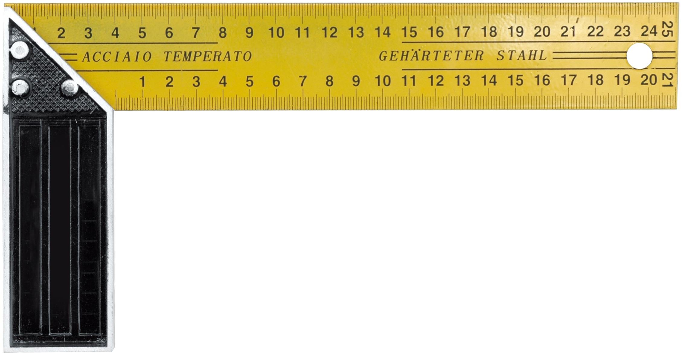 Uholník – tesársky, pevný, dĺžka 25 cm, metrická stupnica, príložník súčasťou, materiál kov Uholník s hliníkovým patou, rameno z tvrdeného plechu, lakované, žlté s čírou čiernou milimetrovou stupnicou. Uhol kĺbu: 45°Dĺžka: 250 mm