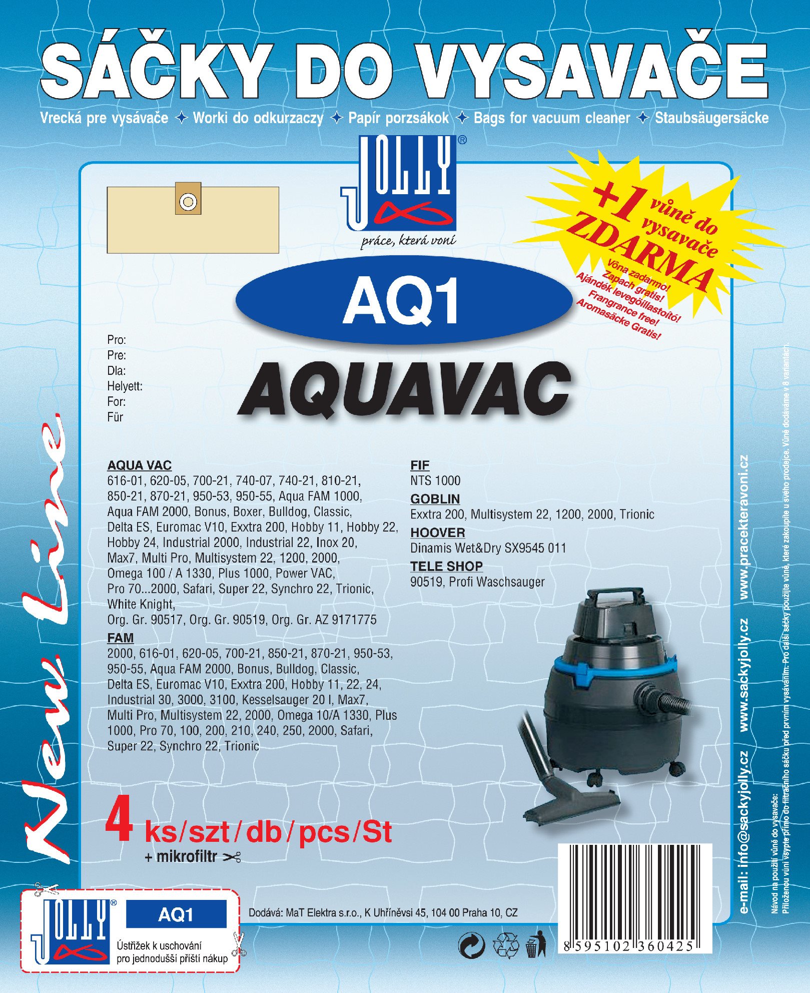 Vrecká do vysávača Jolly – papierové, jednorazové, antibakteriálne, súčasťou balenia je tiež filter a vôňa, 4 vrecká v balení Hlavné vlastnosti sáčkov do vysávača Vrecká do vysávača AQ1 Sáčky do vysávača Jolly ponúknu priestor pre nečistoty až do svojho úplného naplnenia Použitie vrecka do vysávačov je jednorazové Papierový
