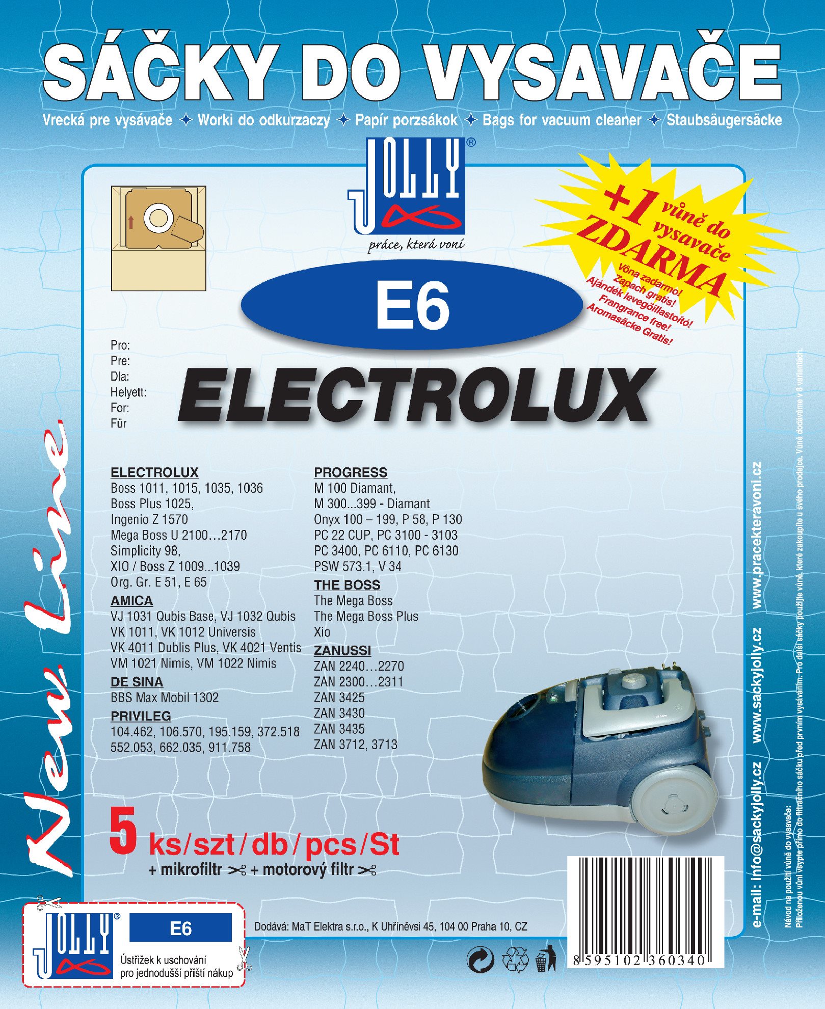 Vrecká do vysávača Jolly – papierové, jednorazové, antibakteriálne, súčasťou balenia je tiež filter a vôňa, 5 vreciek v balení Zásadné prednosti sáčkov do vysávača Vrecká do vysávača E6 Sáčky do vysávača Jolly dávajú vysávaču priestor na stabilný sací výkon, kým sa úplne nenaplnia Použitie vrecka do vysávačov je jednorazové P