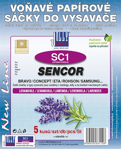 Vrecká do vysávača Jolly – papierové, jednorazové, antibakteriálne, aromatizované, súčasťou balenia je tiež filter, 5 vreciek v balení Hlavné prednosti sáčkov do vysávača Vrecká do vysávača SC1 – vôňa Levandule Sáčky do vysávača Jolly tvoria priestor pre prach a špinu, kým sa úplne nezaplnia Použitie vrecka do vysávačov je jednorazov