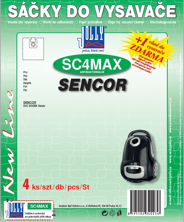 Vrecká do vysávača Jolly – textilné, jednorazové, antibakteriálne, súčasťou balenia je tiež filter a vôňa, 4 vrecká v balení Hlavné prednosti sáčkov do vysávača Vrecká do vysávača SC4 MAX – textilné Sáčky do vysávača Jolly poskytujú miesto pre špinu až do svojho úplného zaplnenia Použitie vrecka do vysávačov je jednorazové