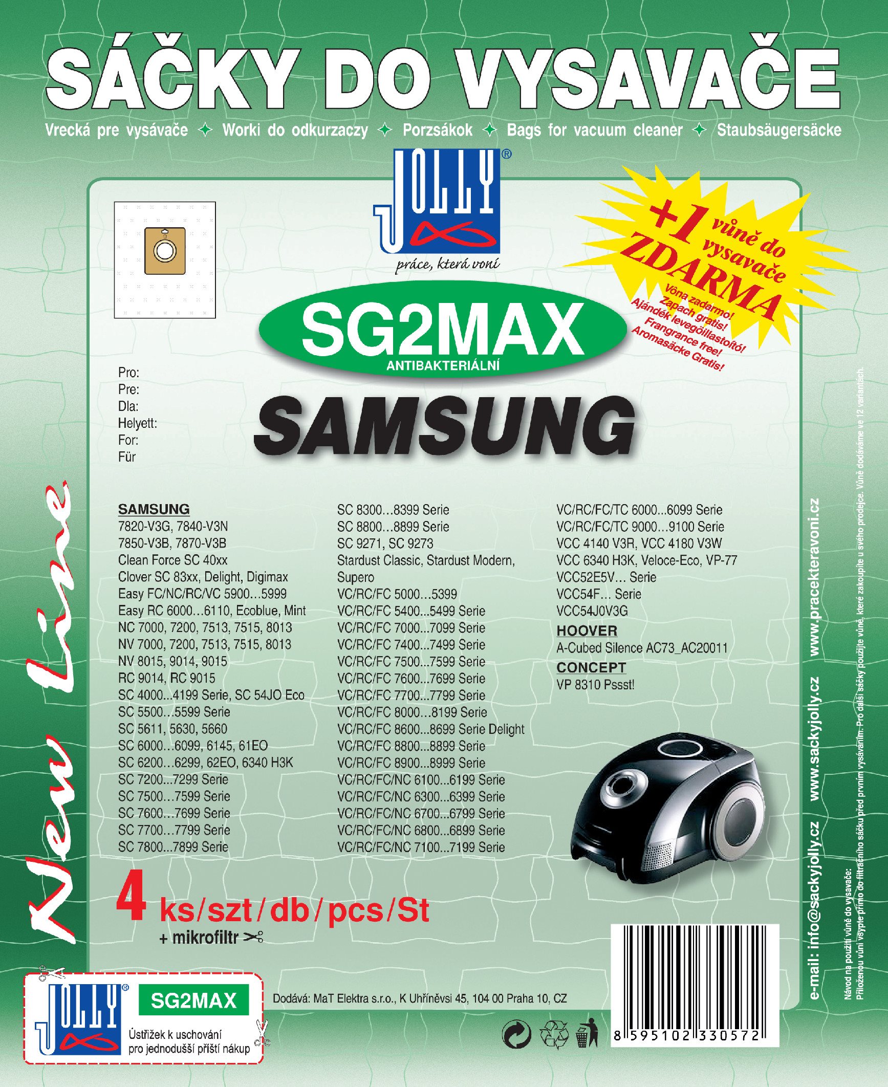 Vrecká do vysávača Jolly – textilné, jednorazové, antibakteriálne, súčasťou balenia je tiež filter a vôňa, 4 vrecká v balení Zásadné prednosti sáčkov do vysávača Vrecká do vysávača SG2 MAX – textilné – vôňa Cherry Sáčky do vysávača Jolly ponúknu priestor pre nečistoty až do svojho úplného naplnenia Použitie vrecka do vysáva