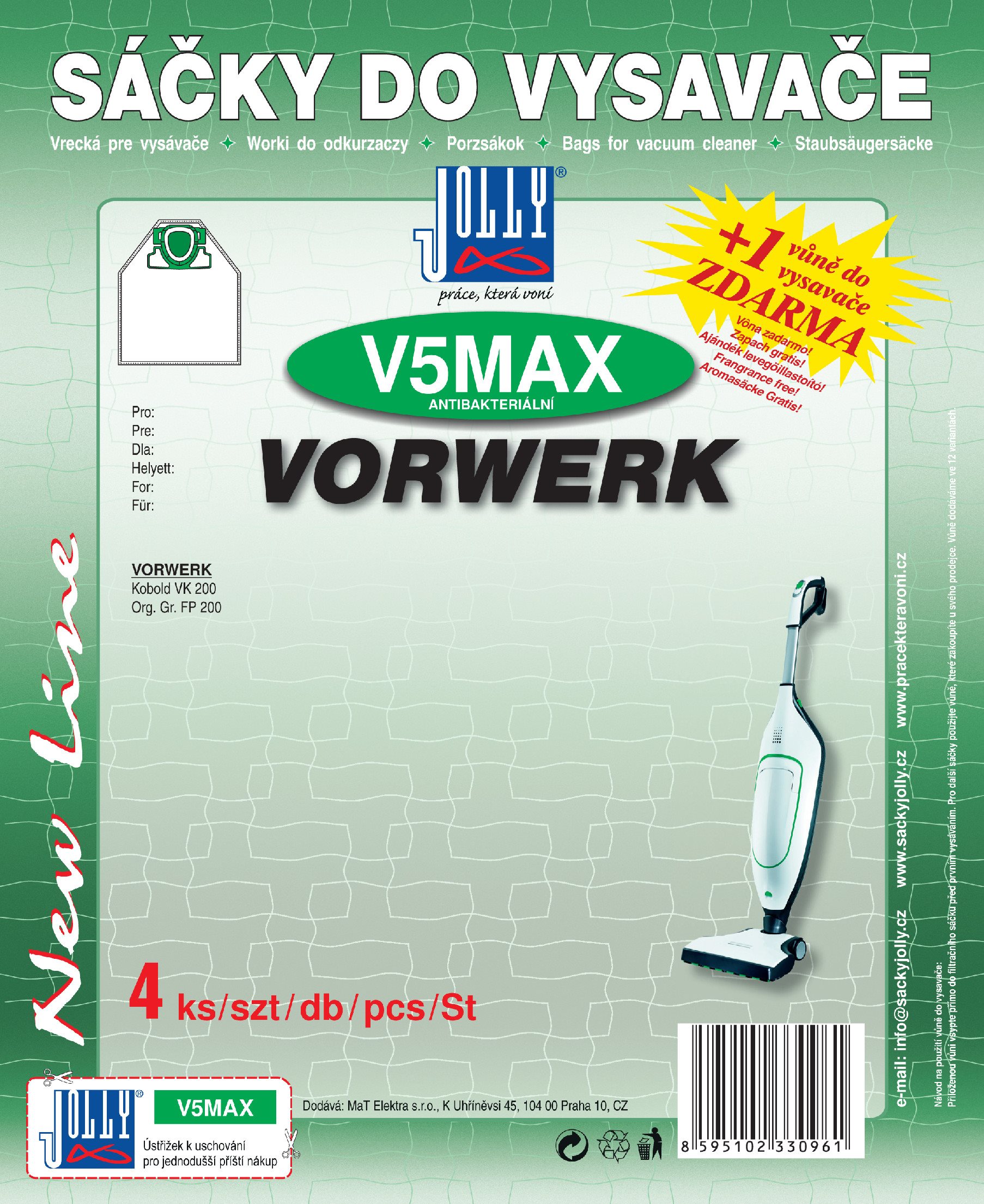 Vrecká do vysávača Jolly – textilné, jednorazové, antibakteriálne, súčasťou balenia je tiež filter a vôňa, 4 vrecká v balení Kľúčové vlastnosti sáčkov do vysávača Vrecká do vysávača V5 MAX – textilné Sáčky do vysávača Jolly poskytujú vysávaču priestor na stabilný sací výkon až do úplného naplnenia Použitie vrecka do vysávač