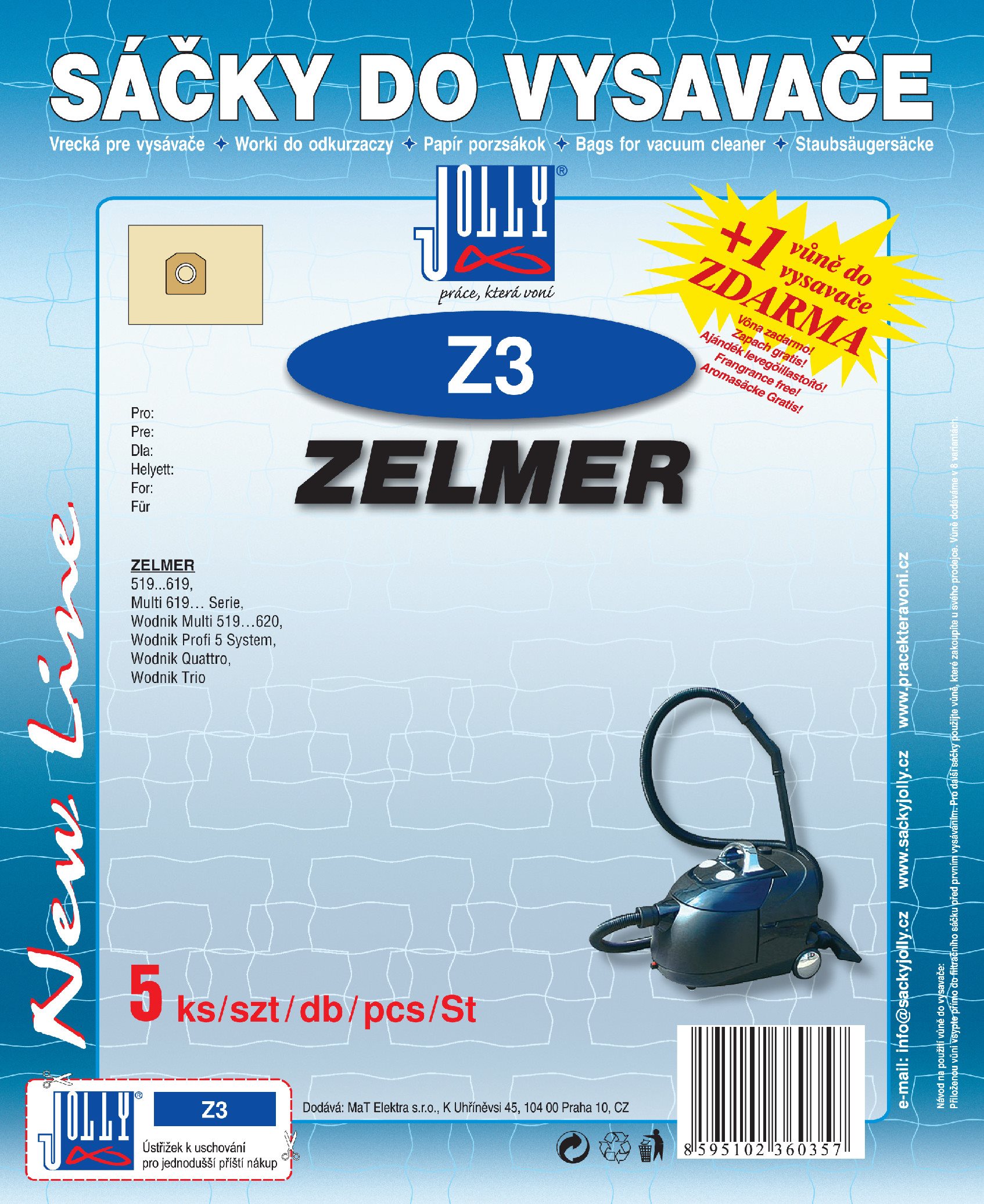 Vrecká do vysávača Jolly – papierové, jednorazové, antibakteriálne, univerzálne, súčasťou balenia je tiež filter a vôňa, 5 vreciek v balení Kľúčové prednosti sáčkov do vysávača Vrecká do vysávača Z3 Sáčky do vysávača Jolly dovoľujú vysávaču fungovať na stabilný sací výkon až do svojho naplnenia Použitie vrecka do vysávačov je jednorazové