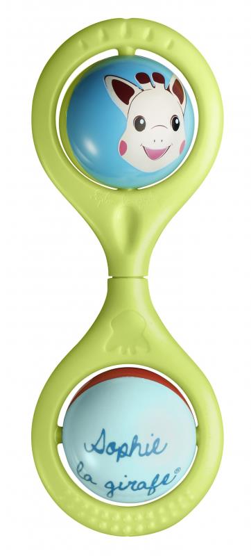 Hrkálka – plastová, umývateľné vyhotovenie, rolnička súčasťou, možnosť umiestnenia do ruky, modrá a zelená farba, rozmery 21 × 10,5 × 4 cm (V׊×H), vhodná od 3 mesiacov Vulli činka žirafa Sophie je veselá hrkálka v tvare činky so žirafkou Sophiou a kamarátmi. Jemné farby a zaoblené tvary tejto hrkálky si vaše dieťatko priam zamiluje. Dve guličky, ktoré dieťa môže otá