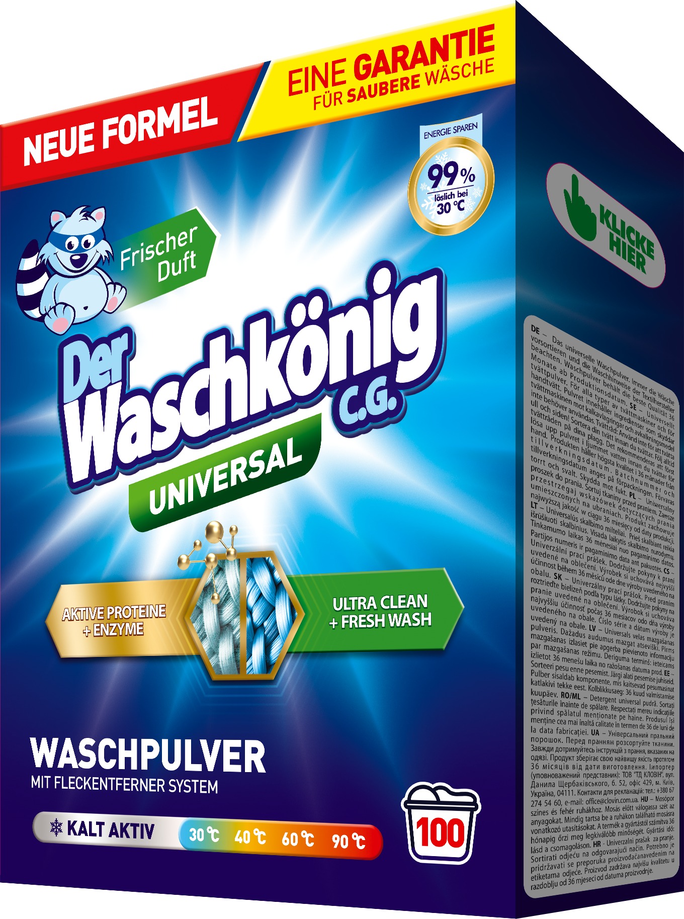 Prací prášok – vhodná farebná a biela bielizeň, odstraňuje škvrny pri praní, na bežné pranie, vystačí na 100 praní, hmotnosť 6000 g Prací prášok od nemeckého výrobcu Der Waschkönig CG s kapacitou 6 kg. Vďaka novému inovatívnemu zloženiu balenie vystačí až na 100 umytí. Krásne vonia a veľmi dobre sa rozpúšťa vo vode. Má vysokú scho