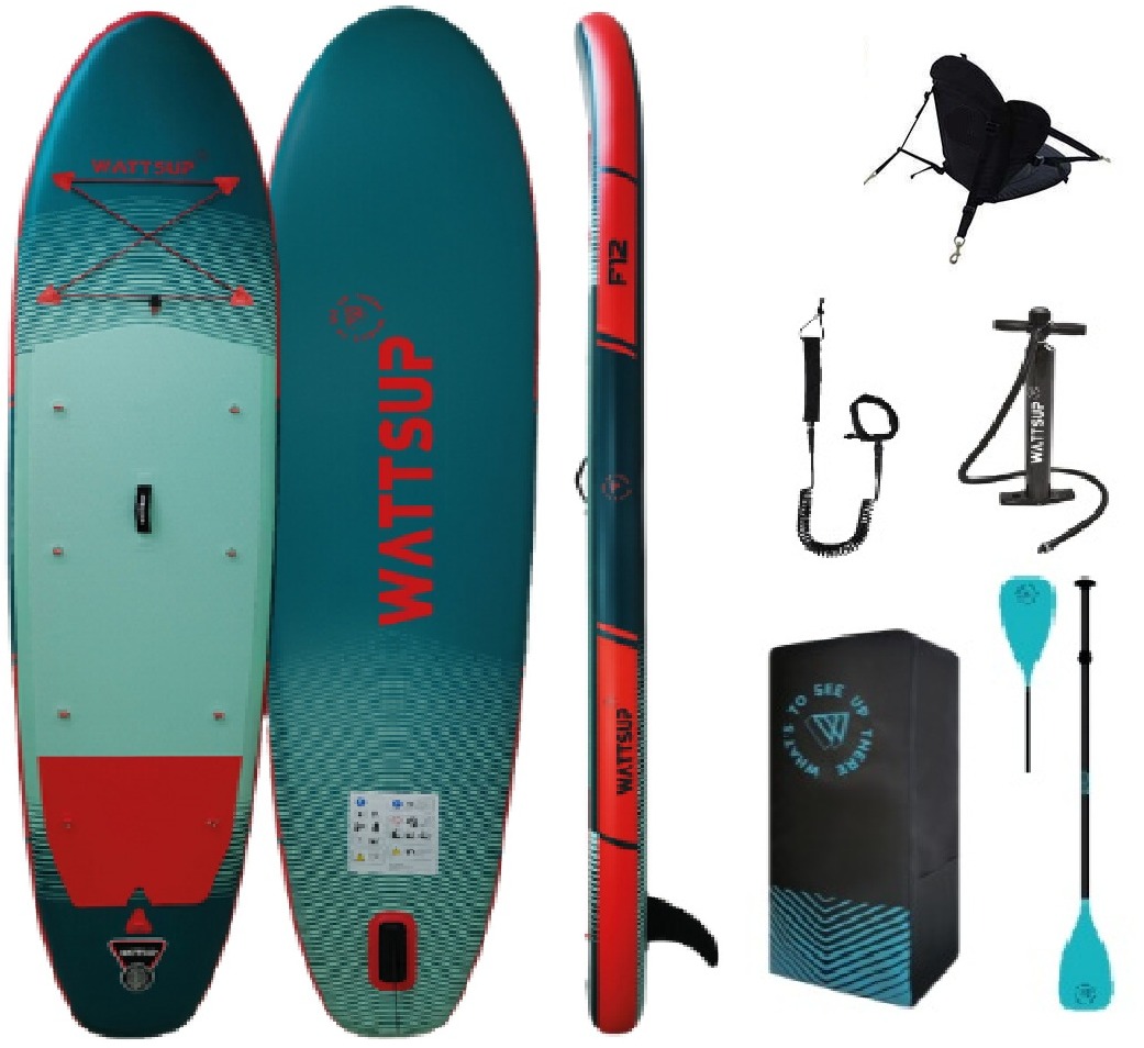 Paddleboard s dĺžkou 365 cm, nosnosť 170 kg, výtlak 360 l, zameranie: stabilita, obsah balenia: pumpa, pádlo, plutva, vak, leash a sedačka Nafukovací paddleboard z radu WATTSUP F-First je navrhnutý pre pohodových používateľov, ktorí ocenia spoľahlivosť, rovnováhu a zábavu na vode. Vhodný na plavbu na jazerách, riekach i pobreží mora. Kon