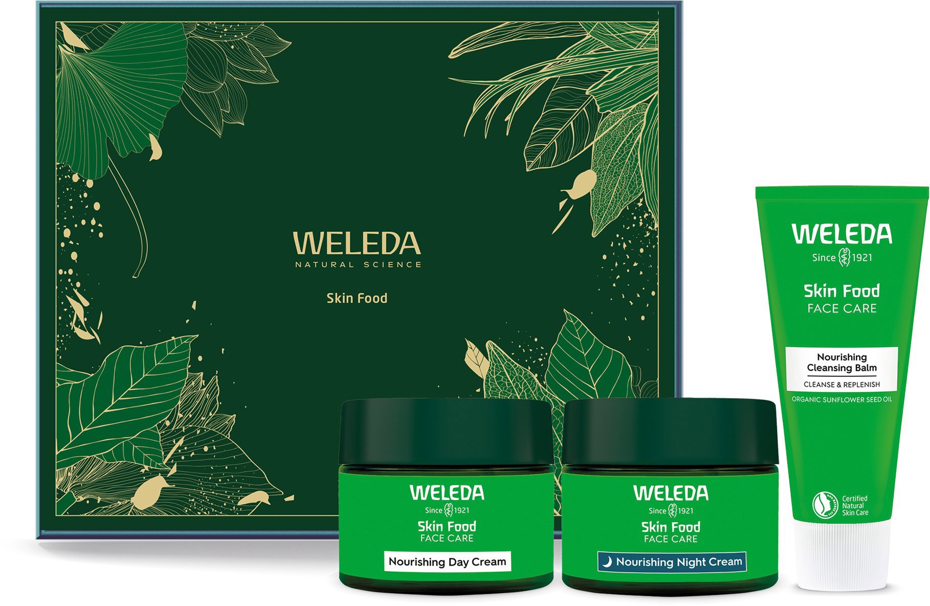 Darčeková sada kozmetiky – obsahuje hydratačný denný krém 40 ml, regeneračný nočný krém 40 ml a čistiaci hydratačný balzam 75 ml, s vôňou bylín, vhodné aj pre vegánov WELEDA Skin Food je darčeková sada prírodnej hydratačnej a regeneračnej starostlivosti, ktorá predstavuje komplexný rituál na zdravú, vyživenú a žiarivú pleť. Nadväzuje na viac ako storočnú tradíciu i