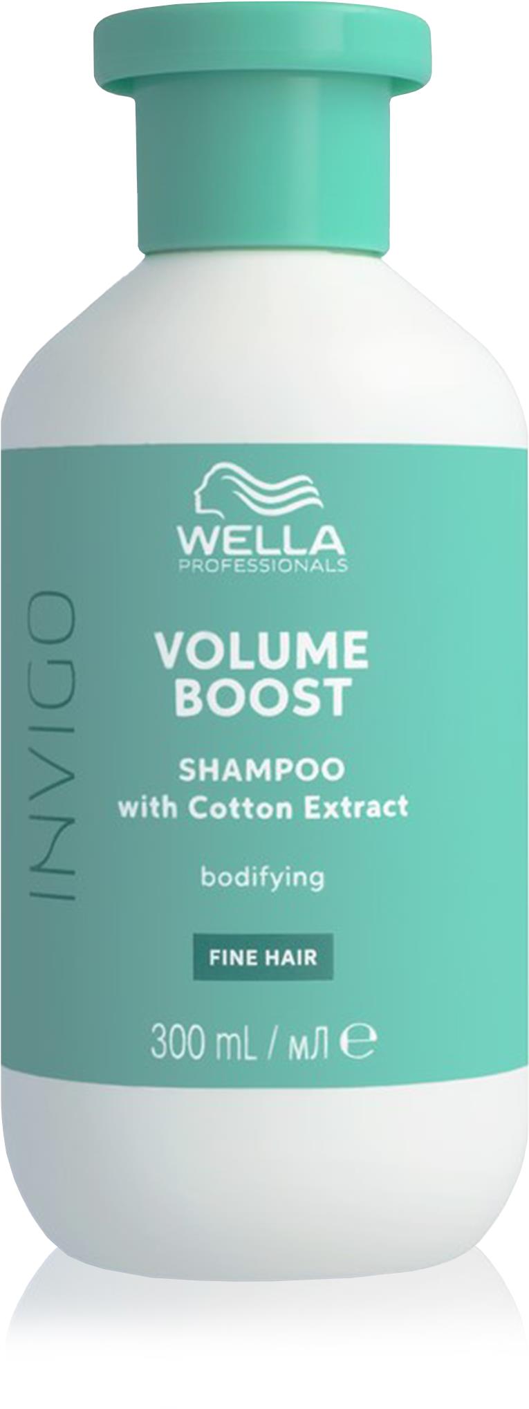 Šampón – tekutý, na všetky typy vlasov, objem 300 ml, profesionálny, ekologický Šampón Wella Professionals z radu Invigo Volume Boost na ľahký objem. Intenzívne čistí vlas a zanecháva ho bez zaťaženia. Technológia Spring Force Blend s extraktom z bavlny dodáva mäkkosť a stabilitu