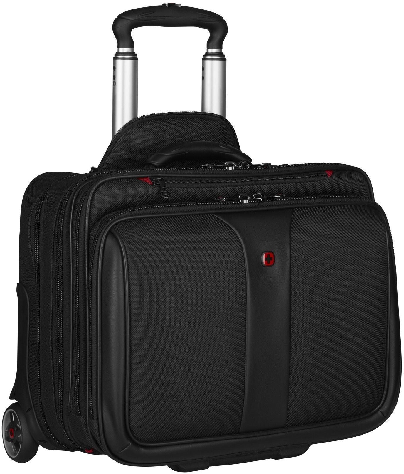 Taška na notebook – pánska, do veľkosti 17″, s vnútorným vreckom a organizérom, zatváranie na zips, materiál polyester, rukoväť, zadný pás na kufor, vonkajšie rozmery 41 × 43 × 31 cm (V׊×H), čierna farba Taška na kolieskach Wenger je svojím decentným štýlom a usporiadanosťou tým správnym prostriedkom na prenos mobilnej kancelárie na dlhších cestách. Pojme notebook až do uhlopriečky 17″ a poskytne mu d