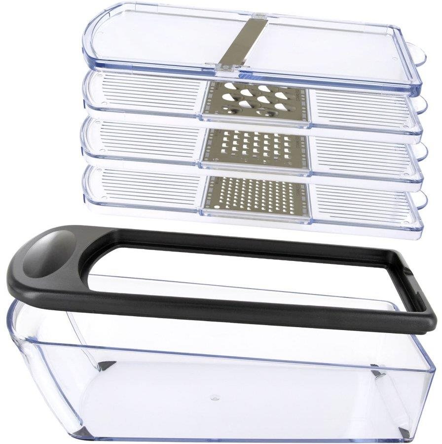Strúhadlo – ručné, určené na zeleninu, všetky typy potravín, nerezové a plastové, s miskou a s nadstavcami, 4 nadstavce súčasťou balenia, 4 typy strúhania, časti vhodné do umývačky, transparentná farba Praktické a užitočné ručné strúhadlo…