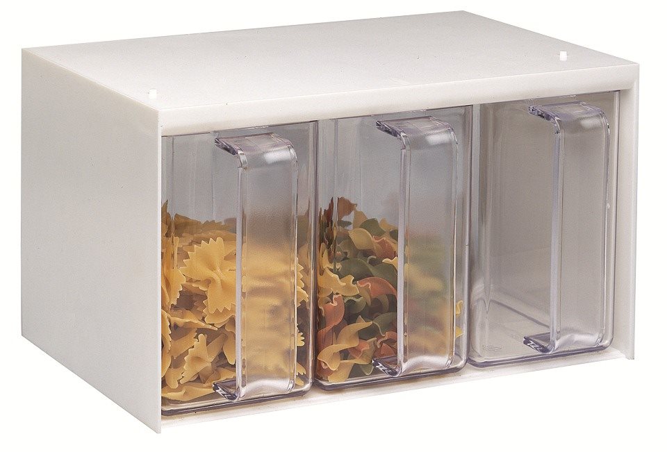 Dózy na potraviny – materiál dózy plast, obdĺžniková, s rukoväťou, bez veka, vhodná do umývačky, 3 dózy WESTMARK Roma je praktickým doplnkom do každej kuchyne, vďaka ktorému budete mať suroviny dobre uskladnené a tiež hneď po ruke. Zásobník je vybavený 3 násypkami, do ktorých môžete uložiť rôzne dr