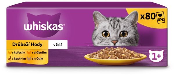 Kapsička pre mačky – určená pre dospelé mačky všetkých plemien s normálnou aktivitou, príchuť hydinová, kačacia, morčacia a kuracia, hmotnosť balenia 6,8 kg Krmivo Whiskas je určené pre dospelé mačky všetkých plemien. Balenie obsahuje 80 mäsových kapsičiek so želé, ktoré podporujú chuť do jedla. Skladajú sa zo 100 % kvalitných ingrediencií a predstavujú k