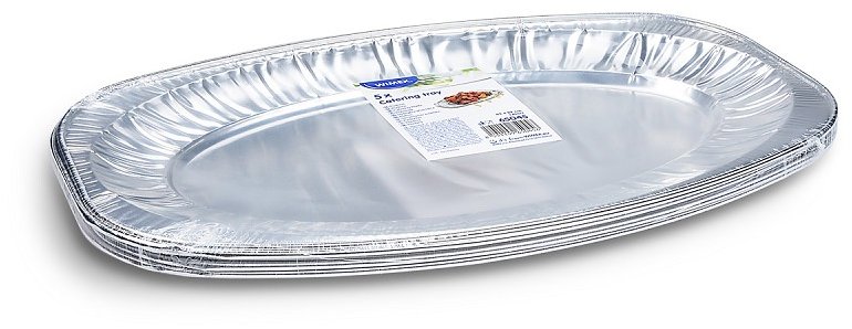 Podnos – 43 × 29 cm, materiál Hliník (ALU), nepoužívať pre silne kyslé a slané potraviny, hmotnosť 0,208 kg, balenie 5 ks, pevný okraj, ideálny na catering a servírovanie, recyklácia: zmiešaný odpad, recyklačný symbol: 41…