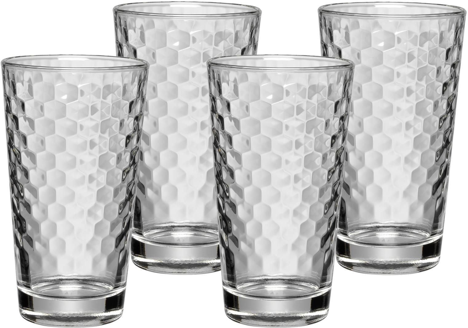 Pohár – 4 ks, objem pohára 280ml, výška 14cm, vyrobené zo žiaruvzdorného skla, hrubé dno, moderná celoplošná štruktúra včelieho plástu, vhodné na teplé aj studené nápoje, ideálne na long drinky, najrôznejšie koktaily a Latte Macchiato,…