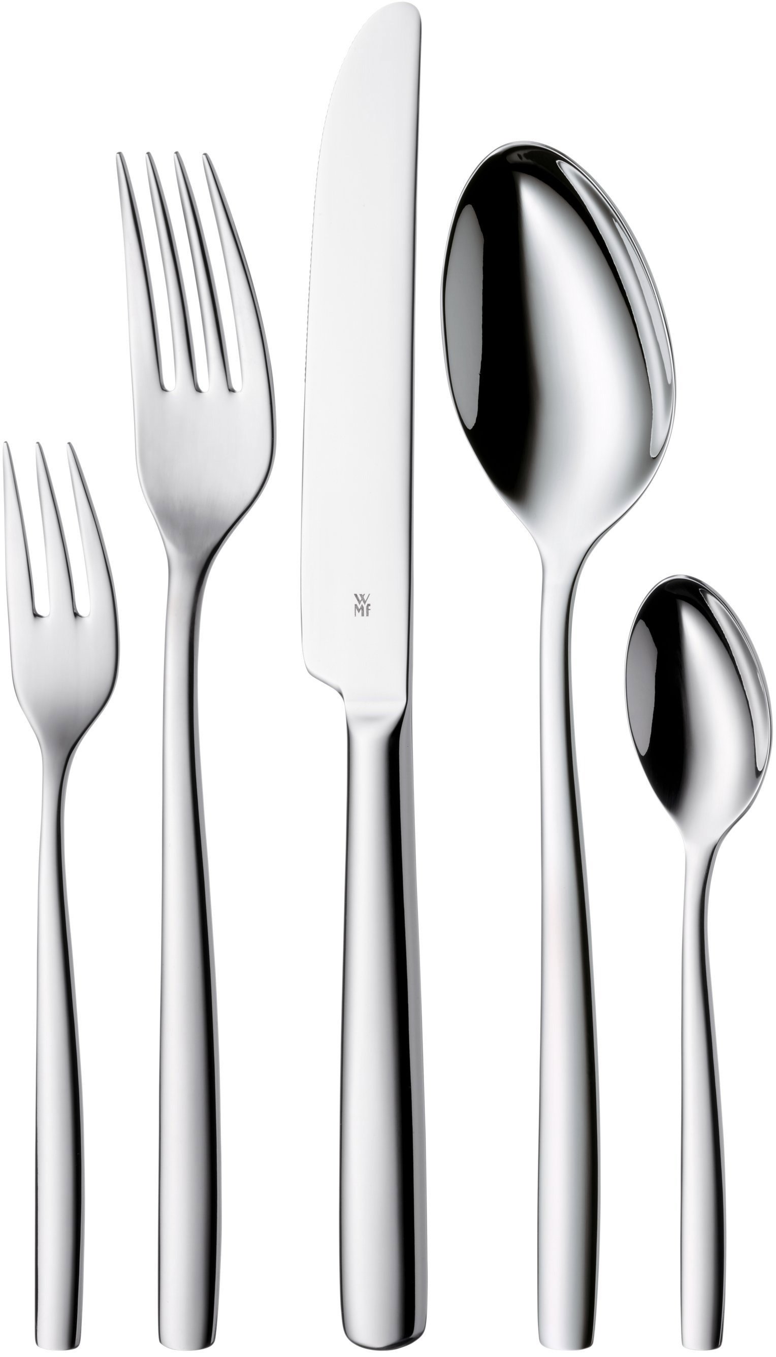 Súprava príborov – jedálenská vidlička, jedálenský nôž, jedálenská lyžica, čajová lyžička a dezertná vidlička, lesklá povrchová úprava, vhodné do umývačky, 5 súprav s celkovým počtom 60 ks Zásadné vlastnosti sady príborov WMF Sada príborov 60…