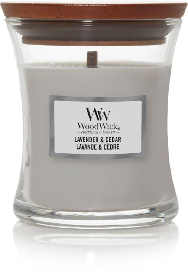 Sviečka – vonná, každodenná, kvetinová a ovocná vôňa s dreveným knôtom, sklenená nádoba, dlhá valcovitý tvar, vysoká, materiál sójový vosk, sivá farba, doba horenia 30 h Jedinečnú atmosféru pohodlia a útulnosti vám pomôže vytvoriť dizajnová sviečka WoodWick Lavander a Cedar s drevitou vôňou. Vaším bytom či kanceláriou sa začne šíriť vôňa levandule, cédra, ružového ko