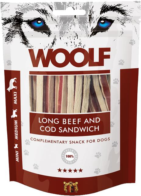 Maškrty pre psov – pre malé, veľké a stredné plemená bez obmedzenia veku s nízkou, normálnou a vysokou aktivitou, hovädzia a tresčia príchuť, hmotnosť balenia 0,1 kg, suché, hrubé bielkoviny 30 %, tuky 4 %, špecifiká zloženia bez konzervantov Woolf Soft Long Beef and Cod Sandwich sú chutné sendvičové maškrty pre psy, vyrobené zo 100 % kvalitných zdrojov bielkovín. Kombinácia hovädzieho mäsa a tresky zaisťuje vysokú nutričnú hodnotu a výbor