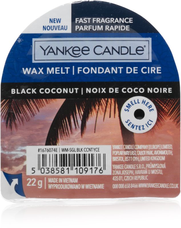 Vonný vosk – svieža vôňa, materiál parafín, hmotnosť 22 g Rozpustený vonný vosk YANKEE CANDLE Black Coconut prevonia veľmi rýchlo celý byt. Môžete ho tiež tuhý vložiť do malých priestorov a tešiť sa zo sviežosti dlhé týždne. Pre maximálny vonný efekt rozpust