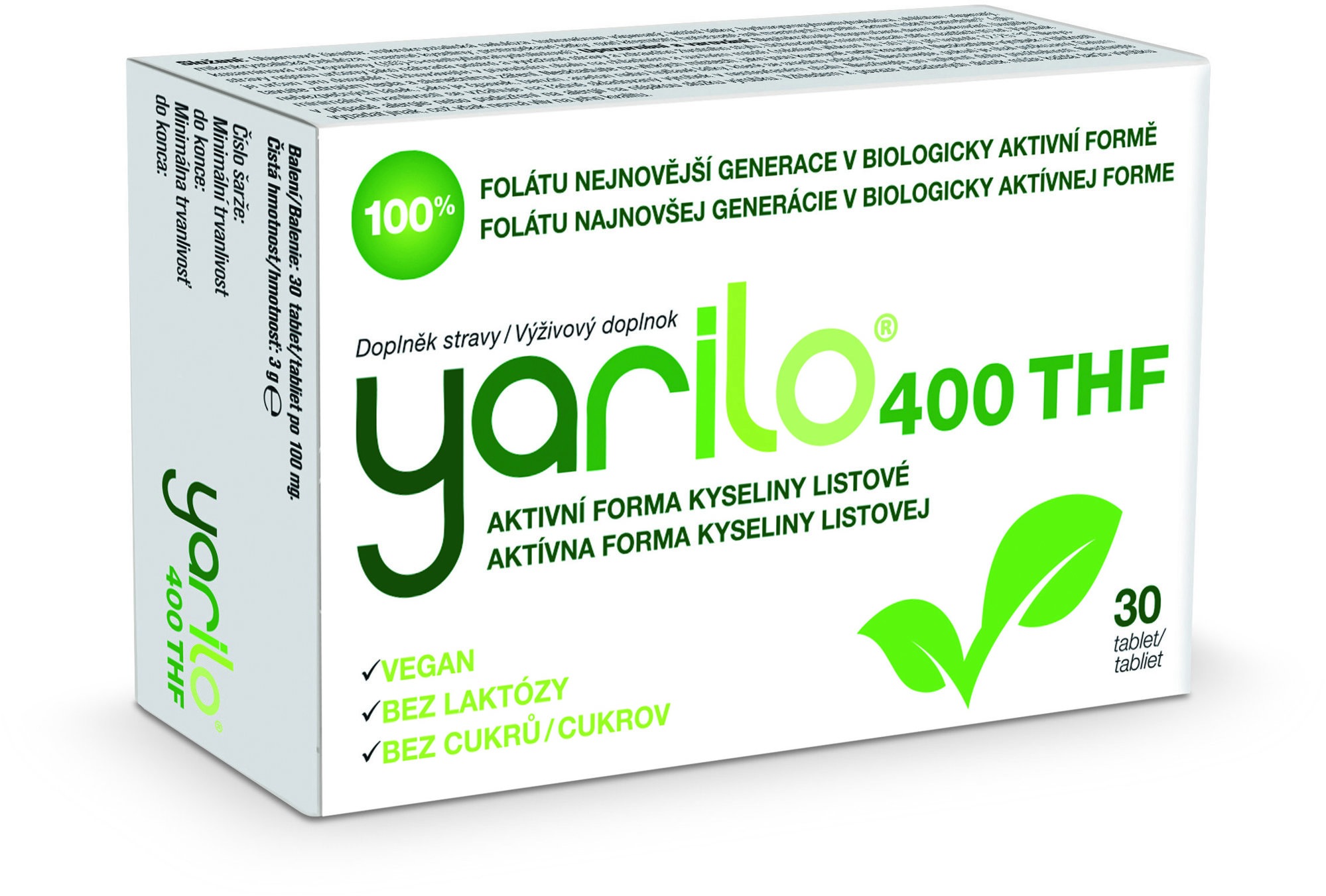 Doplnok stravy – glukozamínová soľ kyseliny (6S)-5-metyltetrahydrolistovej (400 µg v 1 tablete), vegán, 30 tabliet Yarilo 400 THF filmom obalené tablety30 tabliet400 µg plne biologicky aktívneho folátu najnovšej generácie v jednej tablete. Jedna tableta Yarilo® 400 THF obsahuje 400 µg plne biologicky aktívneho fol