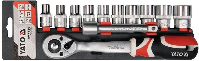 Gola sada – nástrčné kľúče a nadstavce v balení, kazeta súčasťou, 12-dielna, 1/2″ štvorhran, šesťhranný profil hlavíc, materiál hlavíc Chróm-vanádiová oceľ (Cr-V), 72 zubov, ergonomické úchopy a prepínací mechanizmus, celková dĺžka račne 255 mm, rozmery obalu 10 × 33 cm (V׊), hmotnosť 1,6 kg Gola so sadou príslušenstva dovoľuje vykonávať mnoho servisných činností spojených s povoľovaním a uťahovaním závitových spojov rôznych nominálnych veľkostí a tvarov. Produkty značky YATO charakterizu