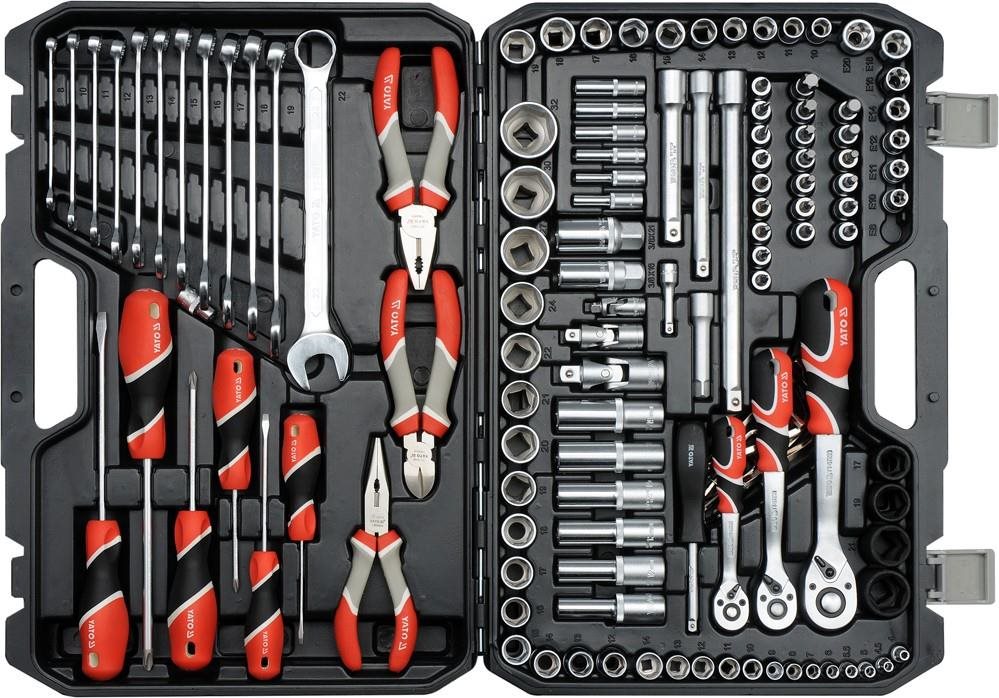 Gola sada – predĺženie, kardanový kĺb, nástrčné kľúče, nadstavce a iné ručné náradie v balení, kufrík súčasťou, 129-dielna, 1/4″, 1/2″ a 3/8″ štvorhran, šesťhranný profil hlavíc, materiál hlavíc Chróm-vanádiová oceľ (Cr-V), plastová rukoväť, 72 zubov, ergonomické úchopy a systém As-Drive, celková dĺžka račne 255 mm, hmotnosť 11,75 kg Gola sada YATO obsahuje 129 komponentov. Sada zahŕňa štvorhran s veľkosťou 1/4″, 1/2″ a 3/8″ a 72-zubovú račňu. Šesťhranný profil hlavice umožňuje efektívny prenos sily a obmedzuje sklz. Ergonomický ú
