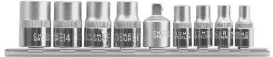 Sada nástrčných hlavíc – nadstavcov 1/4″, 3/8″ TORX 9 ks E5-E16m, Cr. V 6150 Súprava špecializovaných TORX nástavcov je určená pre automobilový priemysel, elektroniku a ďalšiu mechaniku. Nástavce sú vyrobené z chróm-vanádiovej ocele CRV 6150, ktorá…