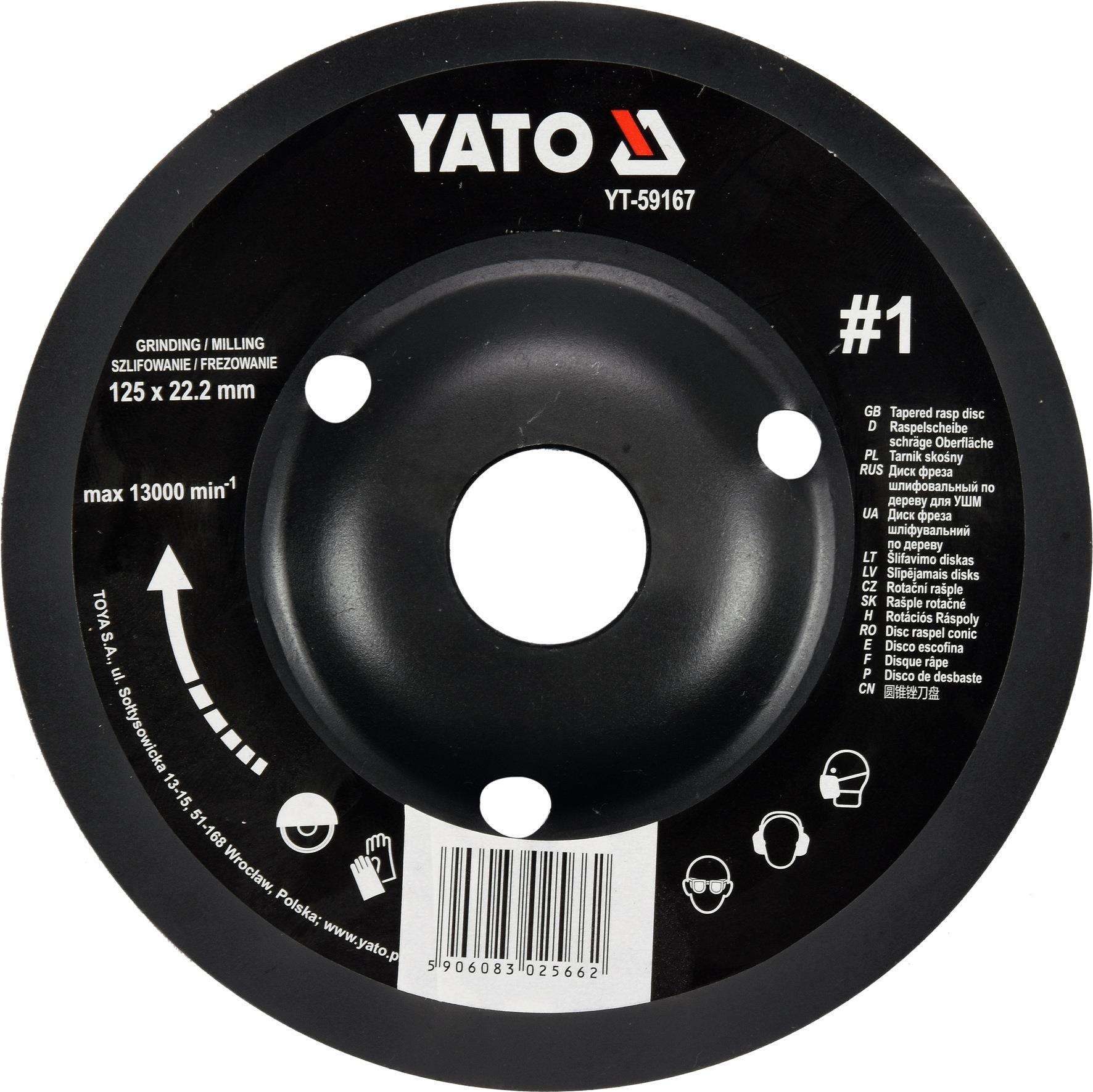 Brúsny kotúč na drevo a plast – rašpľový, priemer 125 mm, maximálna rýchlosť 13000 ot./min, prichytenie X-Lock, montážny otvor 22,2 mm Kľúčové vlastnosti brúsneho kotúča YATO Rotačná rašpľa uhlová hrubá 125 mm typ 1 Brúsny kotúč YATO je špeciálne navrhnutý na spracovanie a brúsenie rôznych materiálov Vďaka hrubému povrchu je schopný