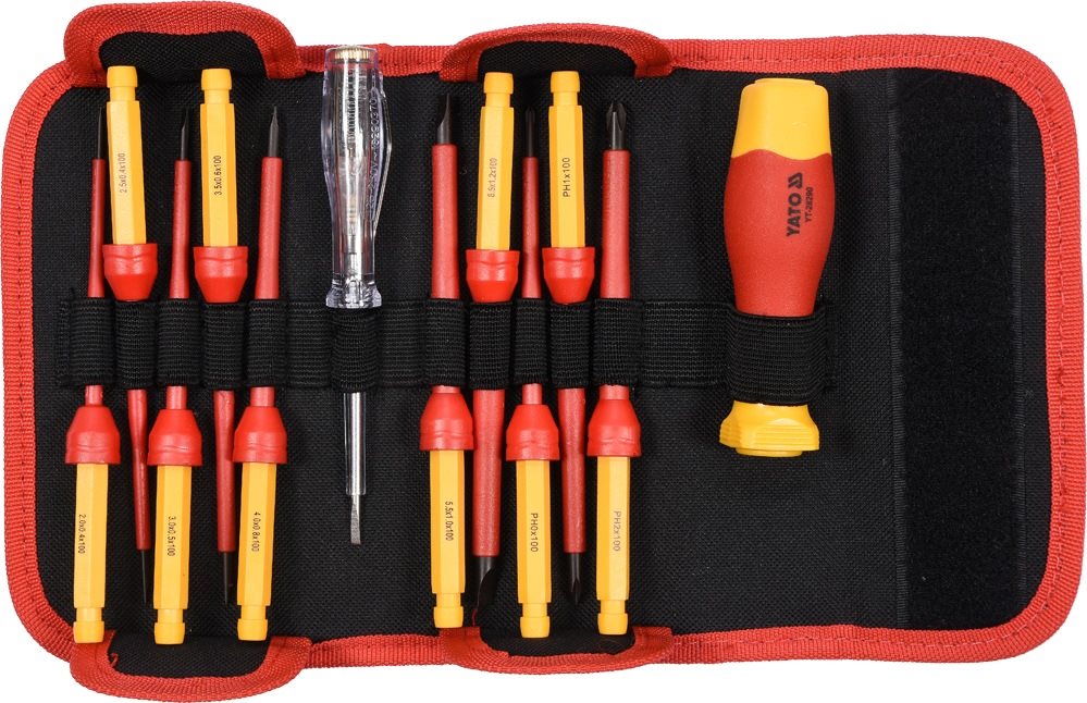 Sada skrutkovačov – ploché, krížové, odizolované, plastové rukoväti, materiál drieku s2 oceľ, 12 skrutkovačov v balení Praktická sada izolovaných skrutkovačov a skúšačky napätia pre profesionálnych i amatérskych majstrov. Súprava obsahuje izolovaný skrutkovač s 10 výmennými koncovkami, ktoré sú vyrobené z kvalitnej ná