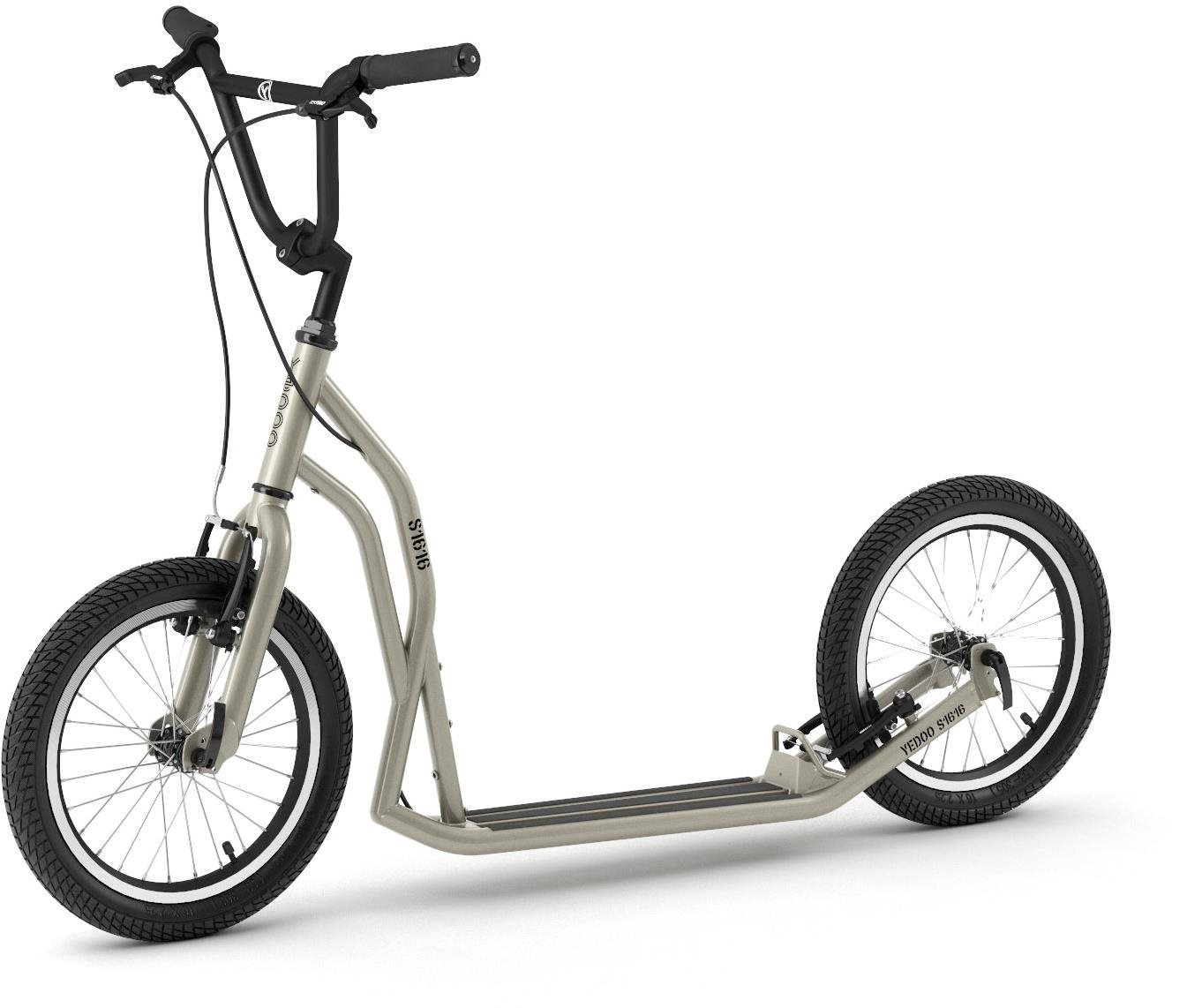 Kolobežka – mestská, pre dospelých, nosnosť 150 kg, pre jazdca s minimálnou výškou 140 cm, materiál rámu oceľ, materiál držadiel TPR/TPE, dĺžka 138 cm, výška riadidiel od 90 do 100 cm, rozmery nášľapu 6,8 × 40 cm (V×D), čeľusťové brzdy, materiál koliesok pneu, hmotnosť 8,4 kg Street kolobežka Yedoo S1616 silvergold je ideálna do mestského prostredia, ale predstavuje aj ostrieľaný outdoorový typ. Kolobežka má odľahčený oceľový rám s vycizelovanou geometriou a optimálnou tuh