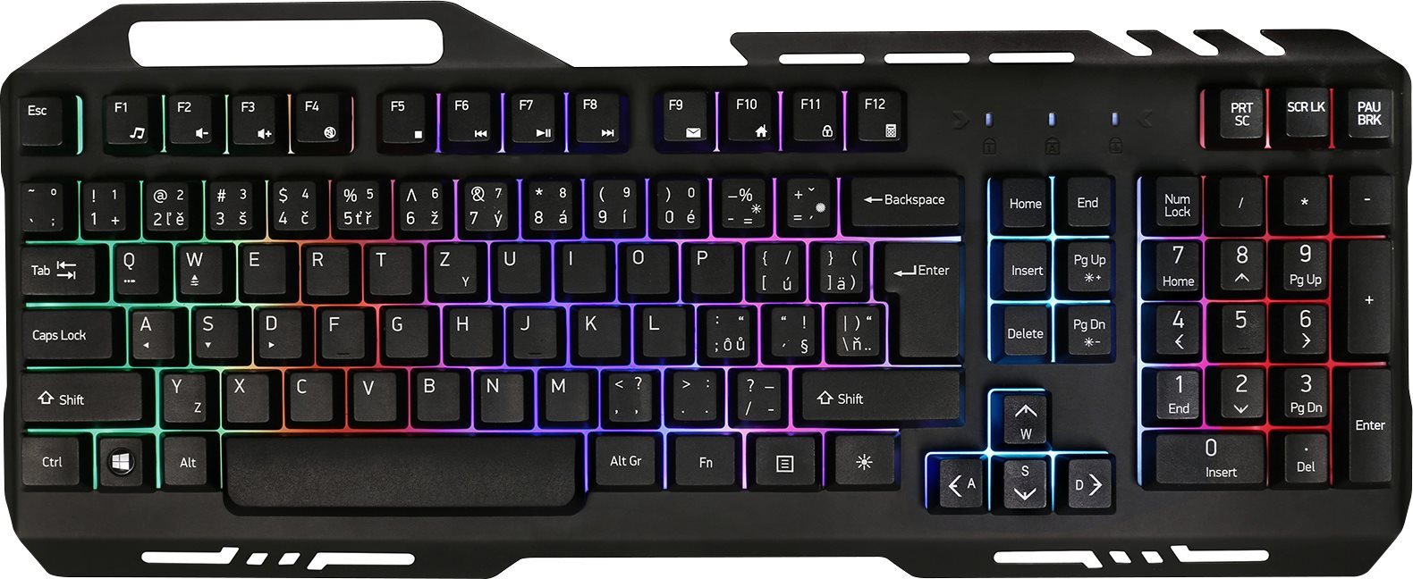 Herná klávesnica – membránový spínač, drôtová, podsvietená, nízkoprofilové klávesy, česká a slovenská lokalizácia klávesov, USB-A, čierna farba, rozmery 3,2 × 43,5 × 17,5 cm (V׊×H) So mnou to máš vo vreckuSom tvoje tajné eso v rukáve, s ktorým vyhráš každú bitku. Vynikám až neobvyklou odolnosťou, takže prežijem aj tvoj občasný rage mód. Moje kovové telo je pretkané klávesm