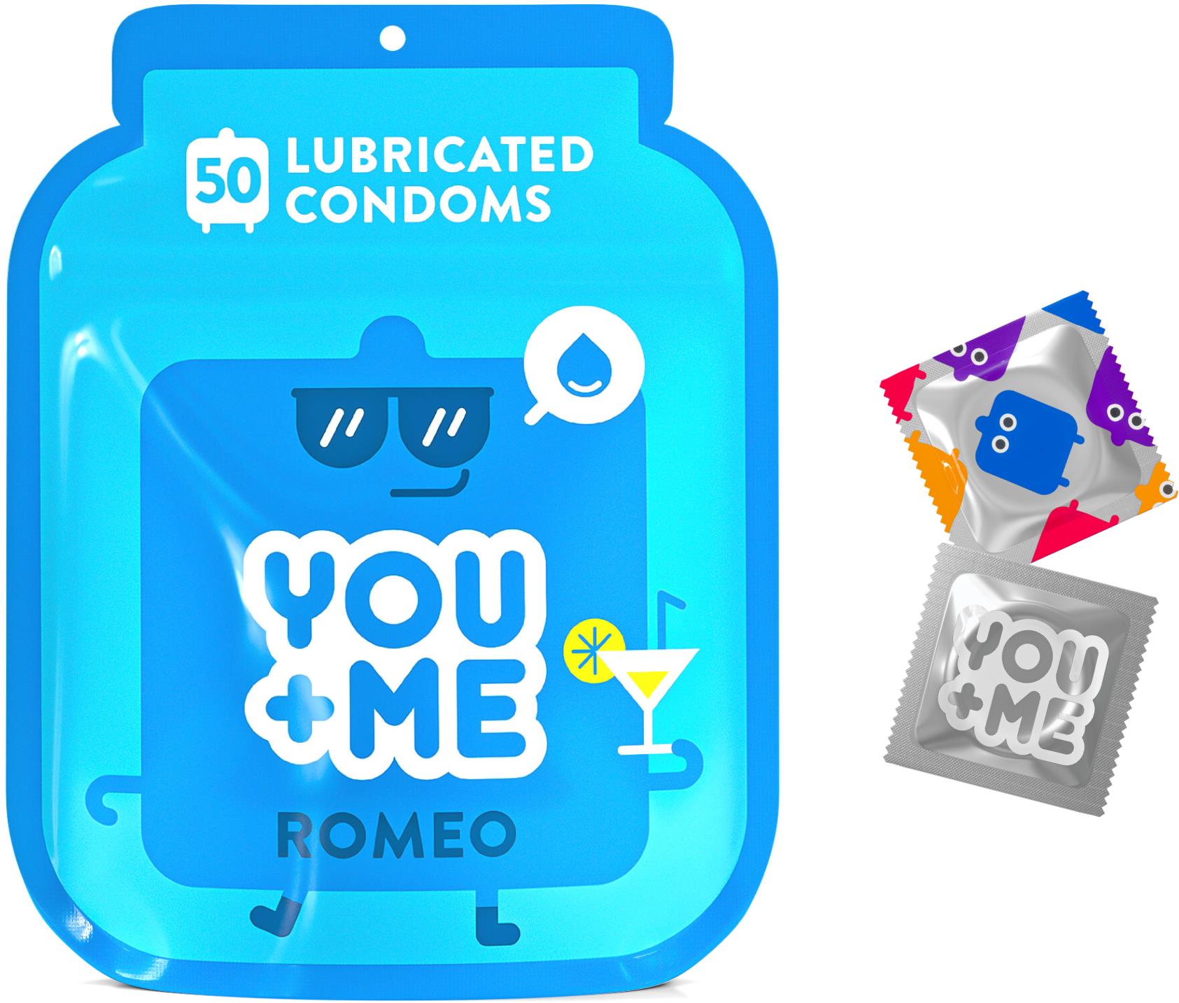 Kondómy – klasické, bio, latexové, zvýšená lubrikácia, veľkosť 53 × 190 mm (Š×D), hrúbka 0,07 mm, 50 kusov v balení Kondómy You Me Romeo so zvýšenou lubrikáciou, o ktorú sa stará kvalitný silikónový olej, majú cylindrický tvar, a tak sa ľahko nasadzujú a nikde neškrtia. Sú vyrobené z prírodného kaučukového latexu.