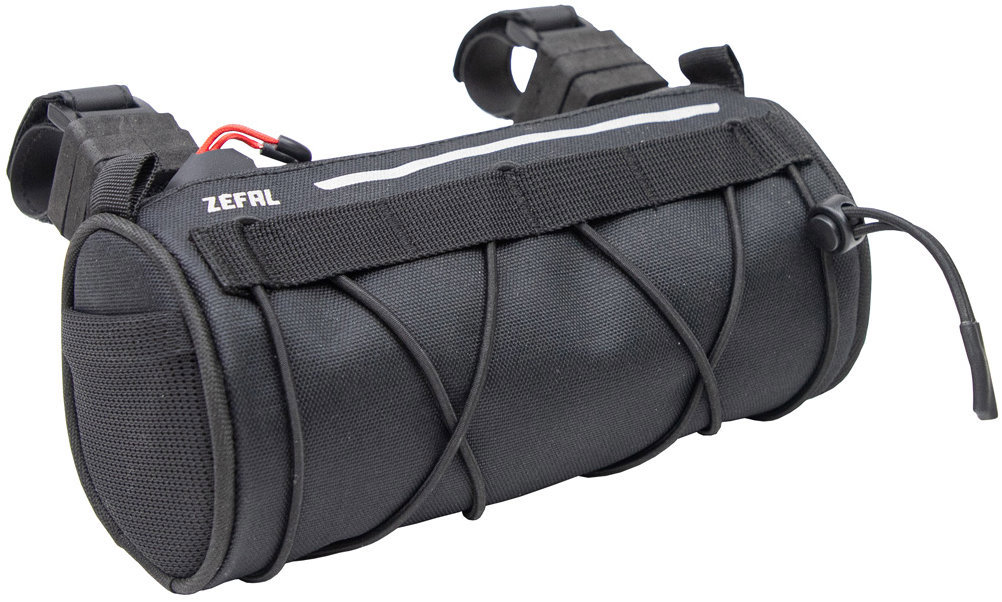 Taška na bicykel – na riadidlá, objem 1,2 l, vodoodolná, umývateľná a vhodná na bikepacking, vo výbave remienok s prackou a suché zipsy, bočné a vnútorné vrecká, reflexné prvky, nepremokavý zips a gumicuk, rozmery 9 × 20 × 9 cm (V׊×H), hmotnosť 0,13 kg, čierna farba