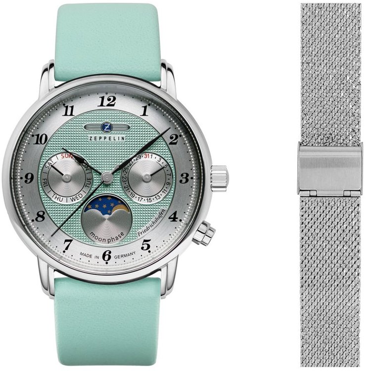 Hodinky dámske – analógové zobrazenie času, automatické, okrúhly ciferník, dátum a mesačná fáza, elegantné, arabské indexy, minerálne sklíčko, vodotesnosť 50 m (5 ATM), materiál puzdra oceľ, strieborná farba puzdra, materiál remienka silikón, tyrkysová farba remienka, na maximálny obvod zápästia 17 cm, s vymeniteľným remienkom, vlastný typ zapojenia ZEPPELIN 8537-2_SADA sú kvalitné dámske hodinky, ktoré spoľahlivo nebudete chcieť zložiť zo zápästia. Tvorí ich okrúhly ciferník s veľkosťou 36 mm. Automatický strojček hodiniek sa postará o nabíjanie