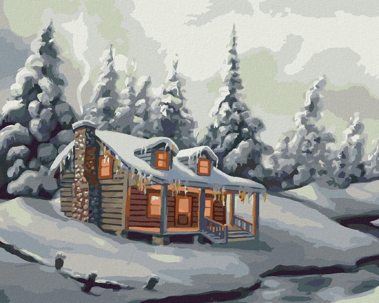 61,78 €Zuty – Maľovanie Podľa Čísel – Zasnežené Stromy, Rieka A Chata V Zime (D. Rusty Rust), 80 × 100 cm, Plátno + Rám